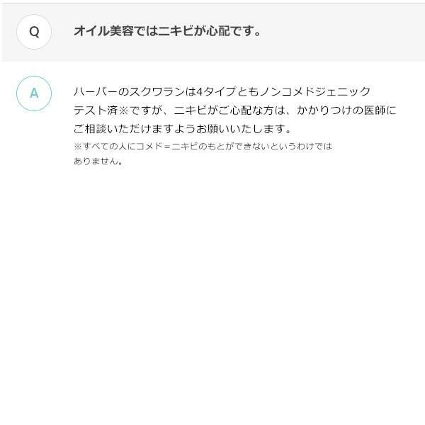 A:ハーバーのスクワランは4タイプともノンコメドジェニックテスト済(※)ですが、ニキビがご心配な方は、かかりつけの医師にご相談いただけますようお願いいたします。