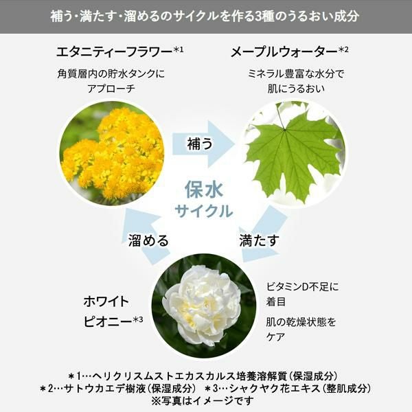 角層内の貯水タンクにアプローチし、水分やうるおいに満ちたふっくらとした肌に導くエタニティ―フラワー※4とミネラル豊富な水分で肌にうるおいを与え、生命の水とも呼ばれるメープルウォーター※5バリア機能を司るタイトジャンクションをサポートして、肌の乾燥状態をケアするホワイトピオニー※6の3種の成分で保水サイクルを作り、肌にうるおいを与えます。