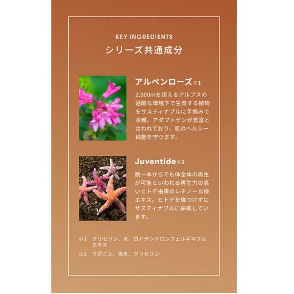 化粧水:水、プロパンジオール、グリセリン、ロドデンドロンフェルギネウムエキス、サポニン、マルトデキストリン、クダモノトケイソウ果実エキス、海水、リボース、カミツレ花エキス、セージ葉エキス、シロキクラゲ多糖体、BG、グリコシルトレハロース、ペンチレングリコール、加水分解水添デンプン、糖脂質、PEG-60水添ヒマシ油、カルボマー、キサンタンガム、コハク酸、ジラウロイルグルタミン酸リシンNa、水酸化K、水添レシチン、香料、エチルヘキシルグリセリン、フェノキシエタノール、1,2-ヘキサンジオール