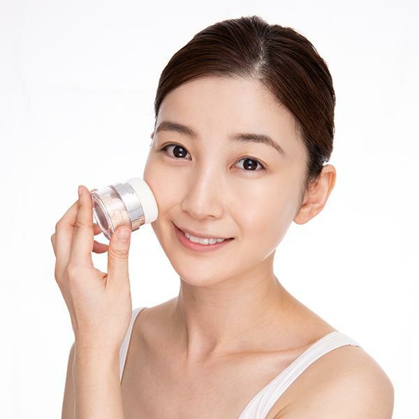 ポンポンと1~2回軽くパフで押さえてパウダーをお肌にのせ、パフをすべらせるようにムラなくつけてください。