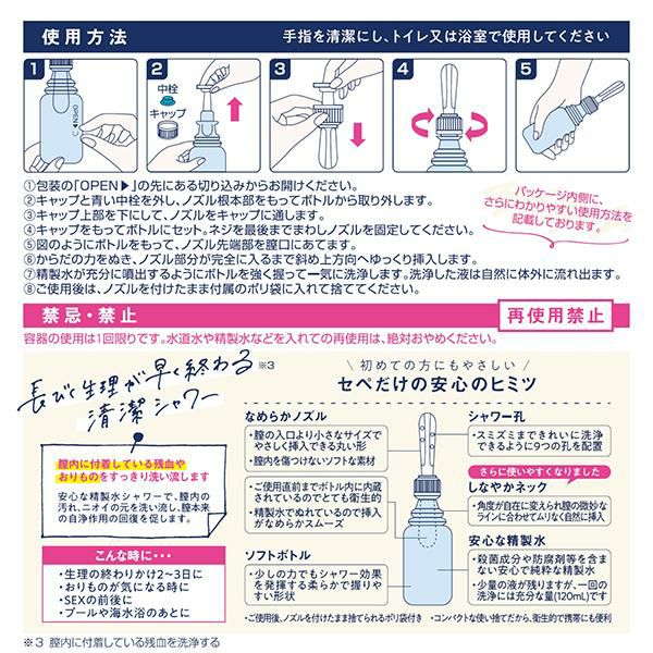 他の画像を見る セぺ プチシャワー・セぺ 120ml×6本入 膣洗浄器 使い切り精製水 臭い対策 日本製 防腐剤不使用 正規品 ギフト可 日付指定可 10%OFF セール価格 ¥ 1,320 税込 カートに入れる お気に入りに登録する